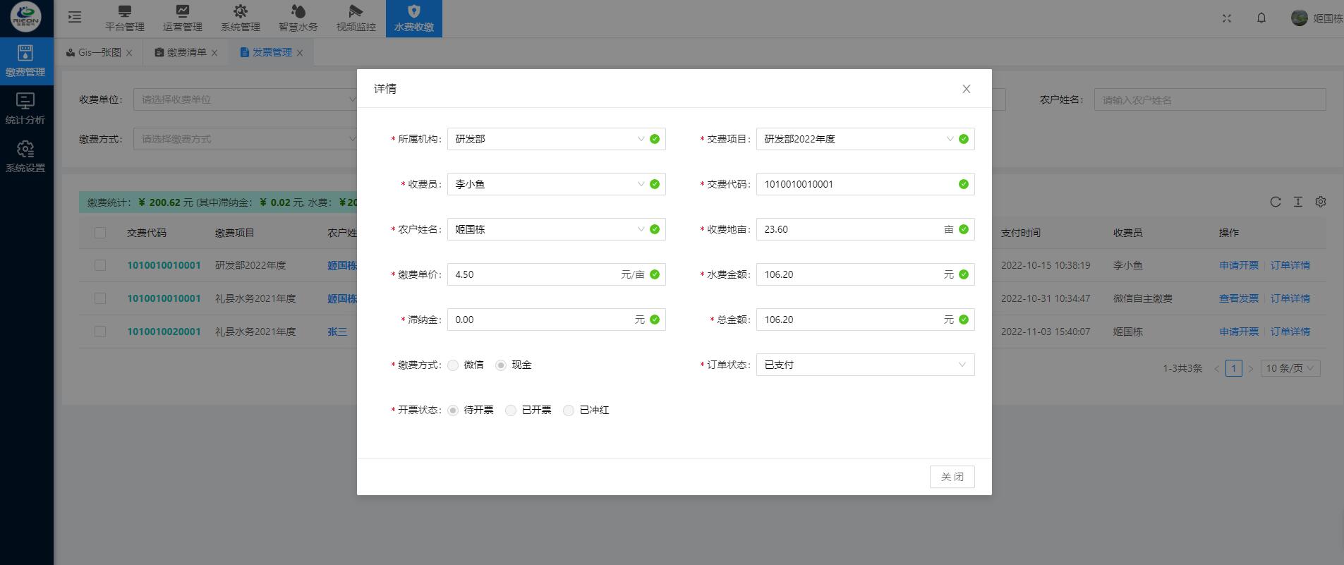 灌區(qū)收費系統(tǒng)運用計算機應用技術以及相關的專用分析軟件和通訊網(wǎng)絡所組成的一個綜合性的收費系統(tǒng)。通過對流經(jīng)用水戶的灌溉 時間以及流量的輸入,計算出該用水戶的水費,生成收費賬單提交至上級審核 ,審核通過即可在線繳費以及他人代繳功能。管理單位可以在手機和電腦網(wǎng)頁上同步查詢相應的用水量以及繳費情況。